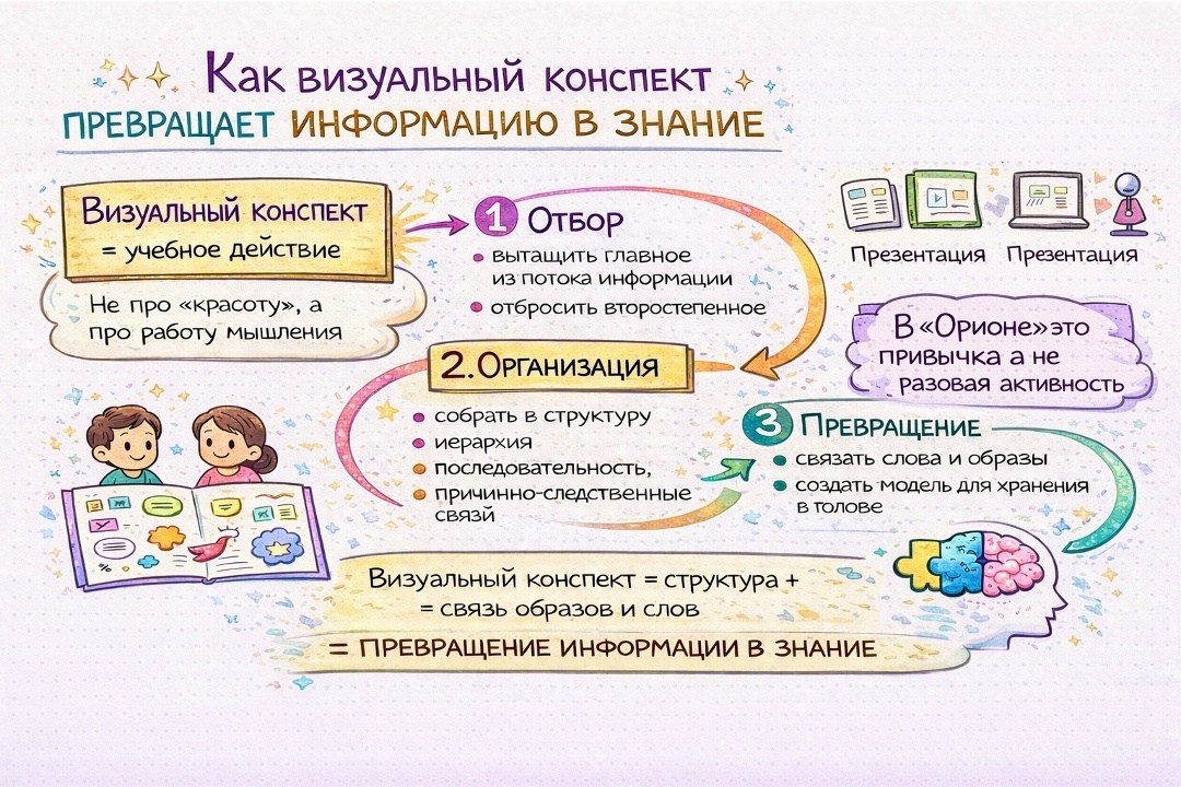 💙 Поэтому в «Орионе» визуальный конспект — это часть учебной культуры: он появляется в материалах, на уроках и при подготовке ответов, помогая ребёнку держать в голове не текст, а систему.